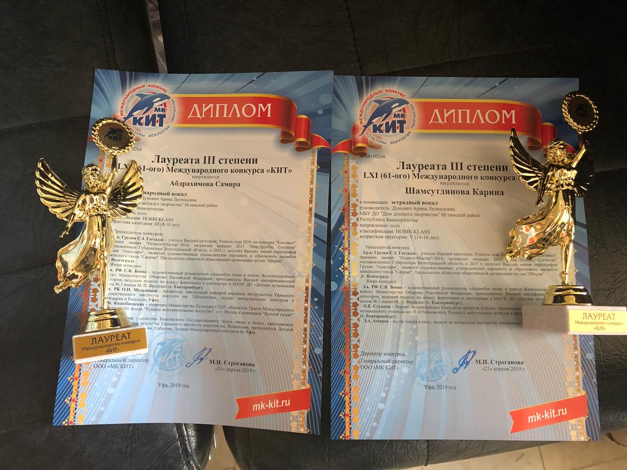 20-21 апреля 2019 года состоялся LXI Международный конкурс «Кит» в г. Уфа. В культурной программе конкурса принимали участие лучшие любительские и профессиональные творческие коллективы со всех уголков России. Коллективы показывали свое мастерство на различных площадках, организованных выступлений. Наш район представили обучающиеся Дома детского творчества, объединения «New star» Абдрахимова Самира (номинация народный вокал) и Шамсутдинова Карина (номинация эстрадный вокал), педагог Дунович Арина Леонидовна. Юные вокалисты уверенно чувствовали себя на сцене, были артистичны, а красивые сценические костюмы стали дополнением их талантливого исполнения песен. Председателем конкурса являлся заслуженный работник Грузии С.З. Гогсадзе, жюри конкурса – заслуженный артист Российской Федерации С.В. Боева, заслуженный работник Республики Башкортостан О.Н. Мельников, отличник Министерства Культуры Л.В. Коцюбиевская, солистка Башкирского Государственного театра оперы и балета, преподаватель кафедры вокального искусства Уфимского института искусств им. З. Исмагилова – Л.В. Буторина.Члены жюри отметили, как непросто было выбирать лучших из лучших. В рамках конкурса преподаватели провели интересный мастер-класс по вокалу и хореографии. Наши вокалисты стали Лауреатами 3 степени, которые были награждены Грамотами и памятными кубками. Хочется поблагодарить всех участников конкурса, педагога Арину Леонидовну за подготовку детей и жюри за профессиональный подход и компетентность.