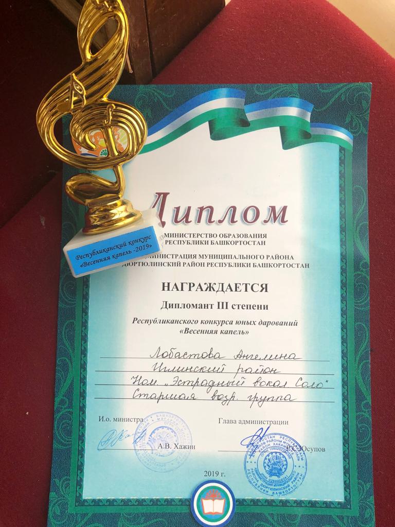 04.04.2019 г. прошел Республиканский конкурс «Весенняя капель -2019» в городе Дюртюли, Республиканский конкурс вокалистов – мероприятие поистине уникальное и уже ставшее знаковым в музыкальной жизни нашей Республики Башкортостан. И это не просто слова, это – резюме мнений участников и членов жюри конкурса, а также тех, кому удалось хотя бы на несколько часов погрузиться в атмосферу доброго, дружеского сотворчества, наш район представила обучающаяся Дома детского творчества Лобастова Ангелина (руководитель Дунович Арина Леонидовна), которая стала Дипломантом III степени.